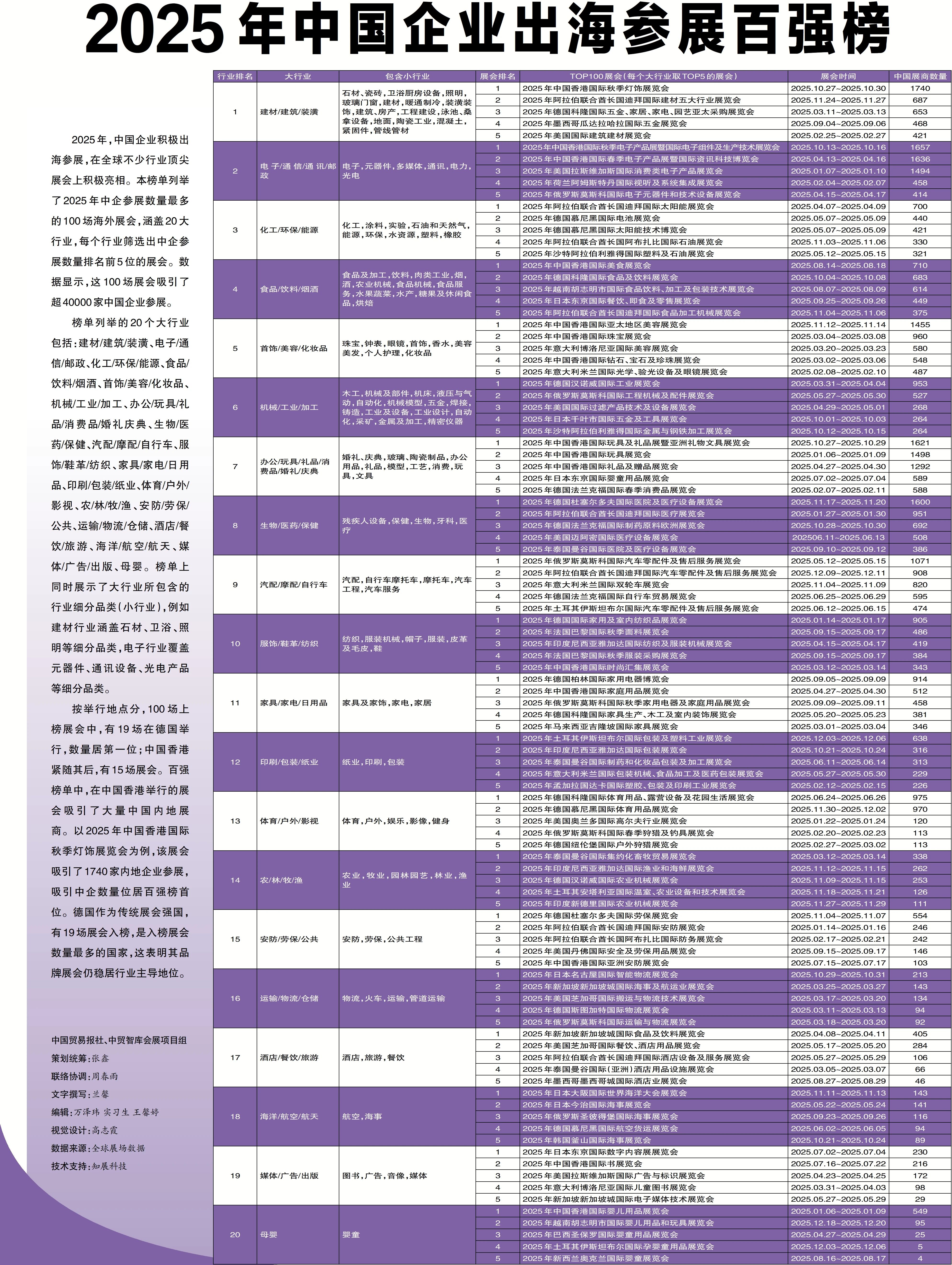 2025年,中国企业积极出海参展,在全球不少行业顶尖展会上积极亮相。本榜单列举了2025年中企参展数量最多的100场海外展会,涵盖20大行业,每个行业筛选出中企参展数量排名前5位的展会。数据显示,这100场展会吸引了超40000家中国企业参展。