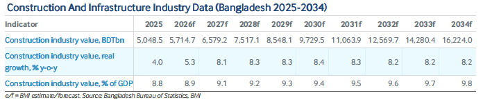 根据惠誉最新发布的报告显示,孟加拉国基建行业近年来展现出强劲的增长势头与巨大的市场潜力,2025年实现4.0%的增长,预计2026年增长加速至5.3%。尽管短期内面临宏观经济与政治不确定性带来的挑战,但中长期增长前景十分乐观。短期内,孟加拉国基建行业发展趋缓,主要原因是政府财政紧缩、政治环境不确定以及供应链瓶颈对项目实施带来的压力,但在有利的人口结构、不断加速的城市化和外国投资回升的支撑下,中长期增长前景依然强劲,预计2025年至2034年的年均增长率将维持在7.5%左右。