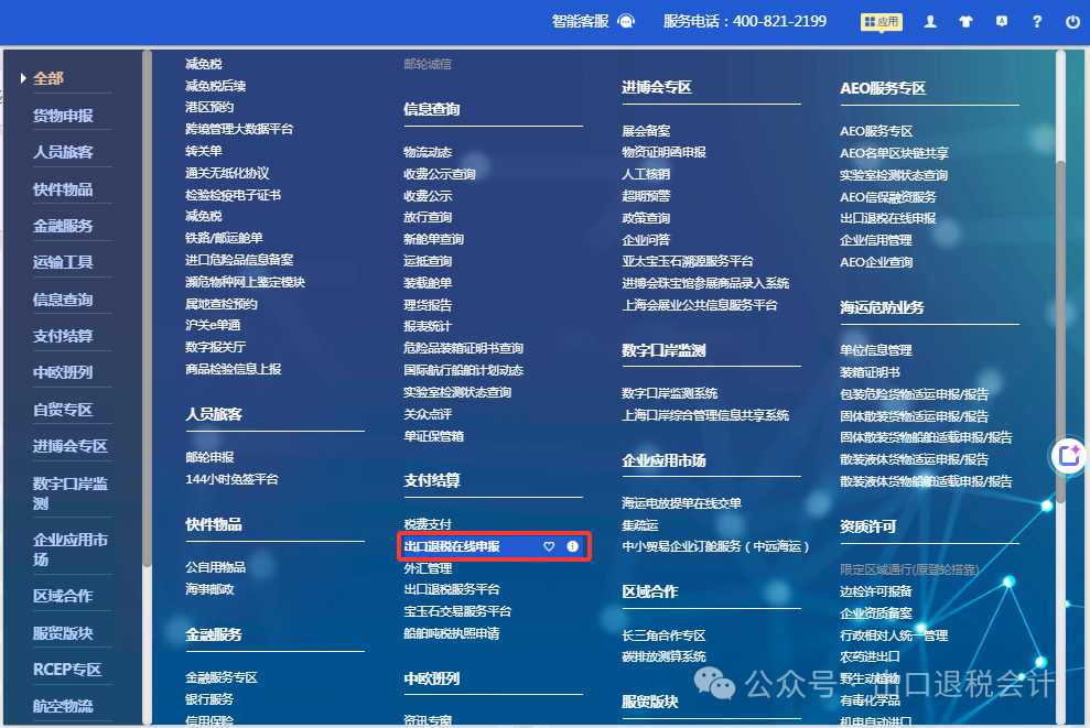 1、登录单一窗口,进入【应用】-【支付结算】-【出口退税在线申报】