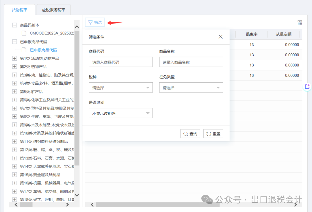 3、进入页面之后,选择【筛选】,录入“商品代码”或“商品名称”,查看具体的出口商品退税率。