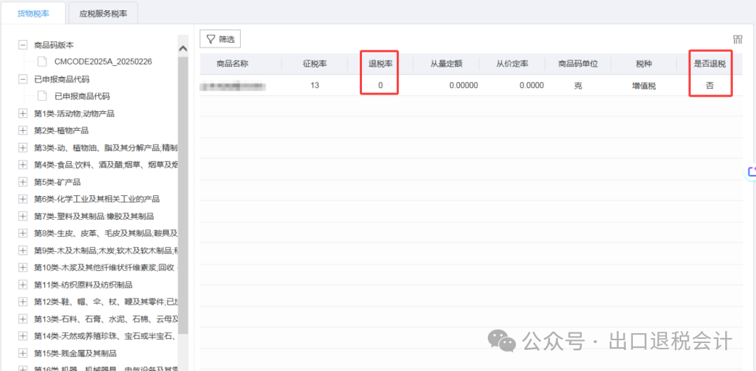 当查询到商品退税率为0时,双击该条商品信息,可以进入商品码详情,查看特殊商品标识。