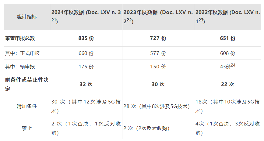 近年来,意大利政府对于外商投资交易的审查愈趋严格。根据PCM向议会提交的关于“黄金权力”制度行使情况的2022、2023、2024年度报告20,近三年来意大利外商投资审查申报以及审查决定的相关数据如下: