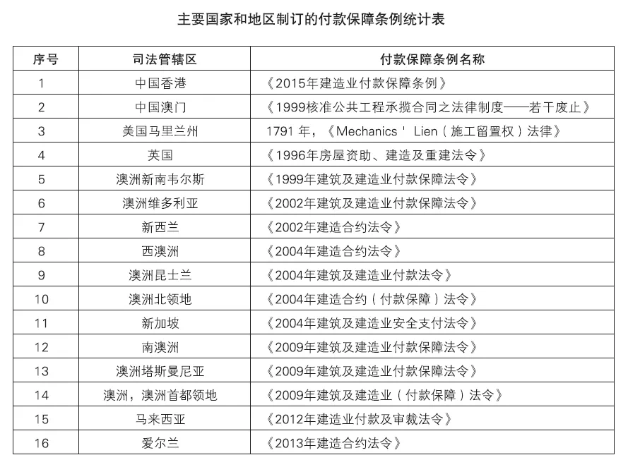 现已制定付款保障条例的主要国家和地区,包括英国、新西兰、澳洲(涵盖六个州和两个领地)、爱尔兰、马来西亚、新加坡、中国香港和中国澳门等,具体付款保障条例的情况详见下页表。