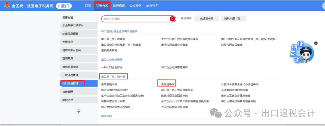 1、登录电子税务局,点击【我要办税】—【出口退税管理】—【出口退(免)税申报】—【免退税申报】功能菜单,进入出口免退税申报模块。