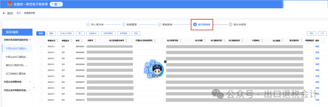 2、完成【报关单导入】-【数据管理】-【智能配单】后,点击【④填写明细表】,跳转至“填写明细表”界面。选择海关监管方式代码为“9810”的出口货物报关单,点击编辑。