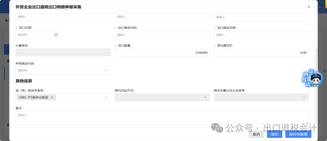 3、进入【外贸企业出口退税出口明细申报采集】界面,在“退(免)税业务类型”栏内下拉选择:HWC-YT|海外仓预退。