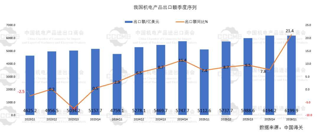 海关总署统计,2026年一季度我国机电产品进出口值同比增长22.4%至9010.1亿美元。其中,出口创6199.9亿美元的季度新高,同比增长21.4%,拉动全商品出口增长12.8个百分点;进口2810.2亿美元,同比增长24.9%,拉动全商品进口增长9.6个百分点;贸易顺差同比增长18.6%至3389.7亿美元,高出全商品顺差746.3亿美元。