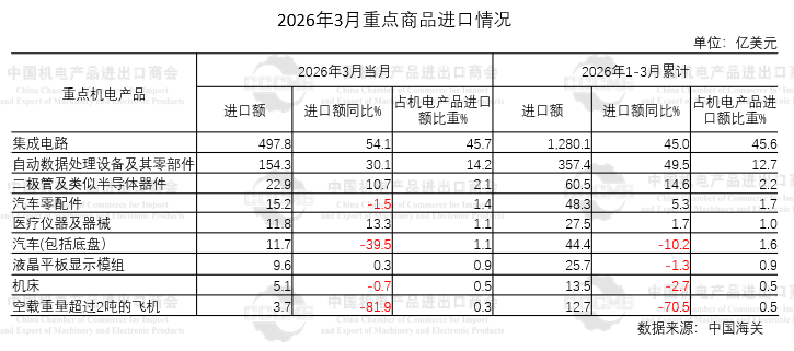 进口方面,一季度集成电路进口量值分别同比增长11%和45%,其中进口额已连续27个月同比增长。3月当月,集成电路进口额同比增长54.1%至497.8亿美元,占机电产品进口总额的比重提升至45.7%,高出2025年全年41%的比重,带动当月机电进口总额创1089.8亿美元的月度新高。