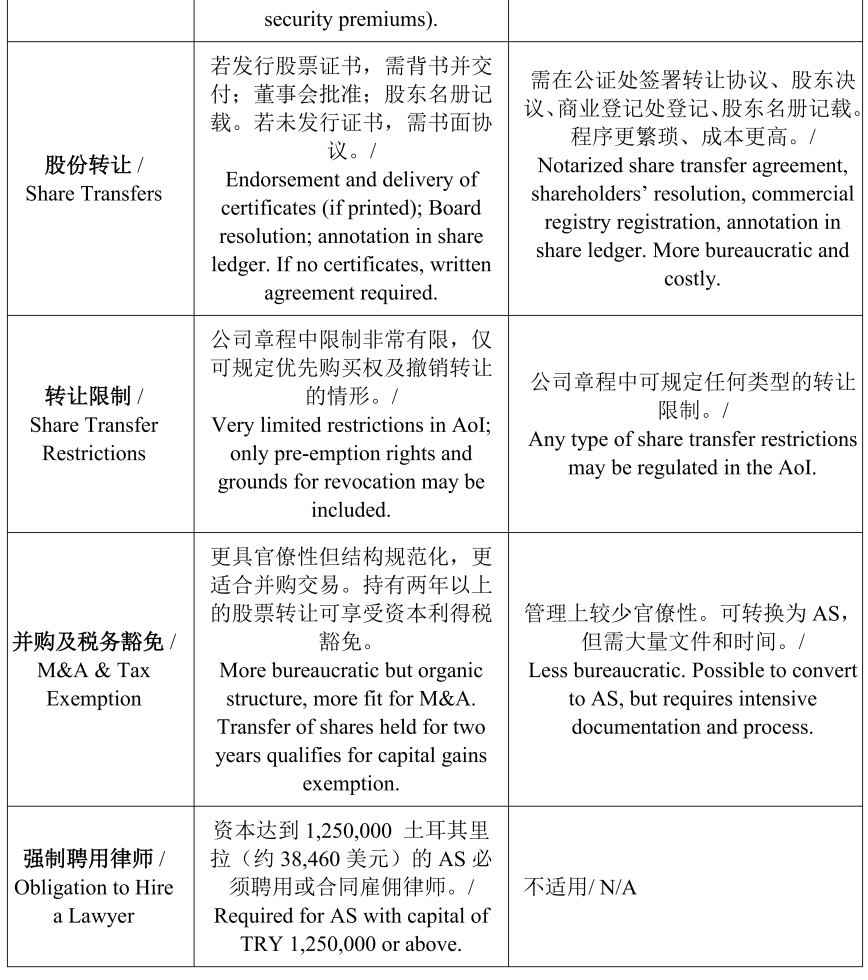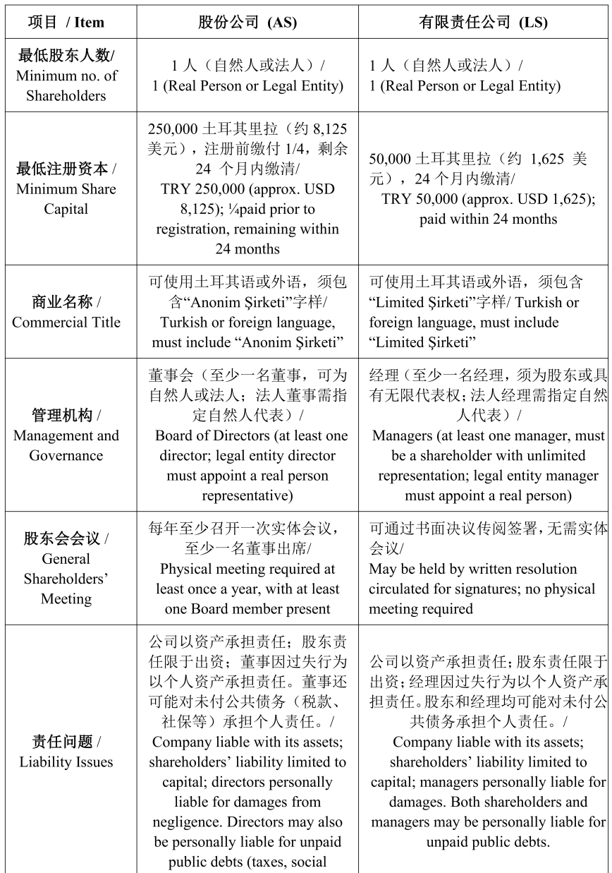 依据土耳其《商法典》,外资可设立的主流公司类型为有限责任公司(Limited Şirket, LS)与股份公司(Anonim Şirket, AS),两者均为有限责任架构,股东责任以出资额为限,但在管理、责任范围、股份转让等方面存在重要差异。