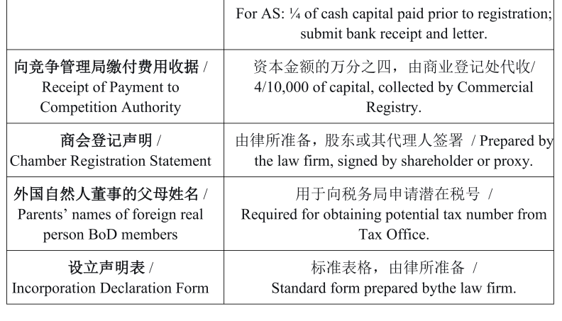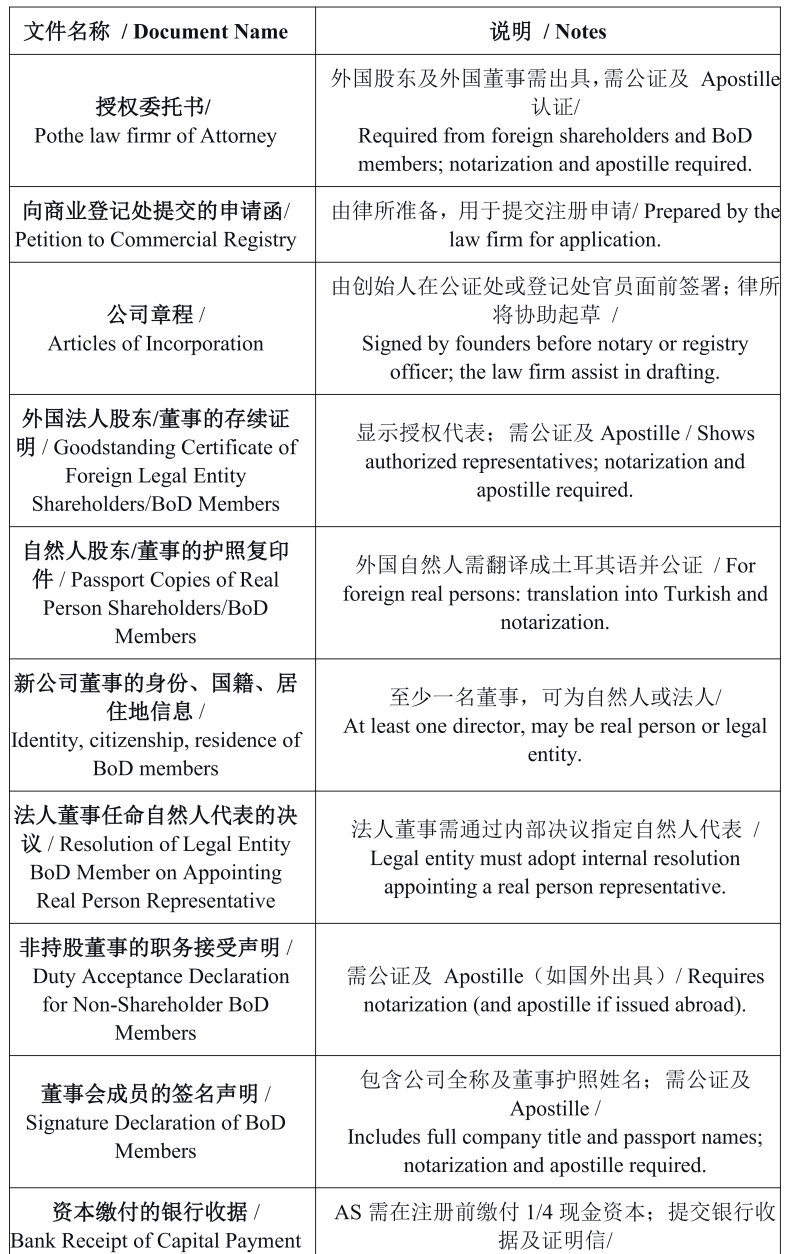 下面是为设立股份公司(AS)而准备的初步清单表格;设立有限责任公司(LS)所需的文件基本相同,仅有细微差别。