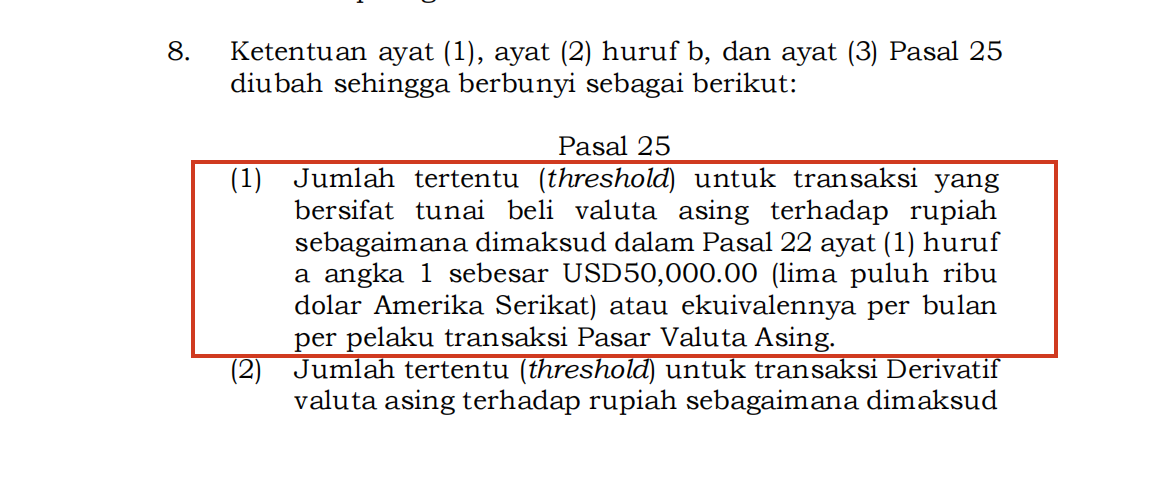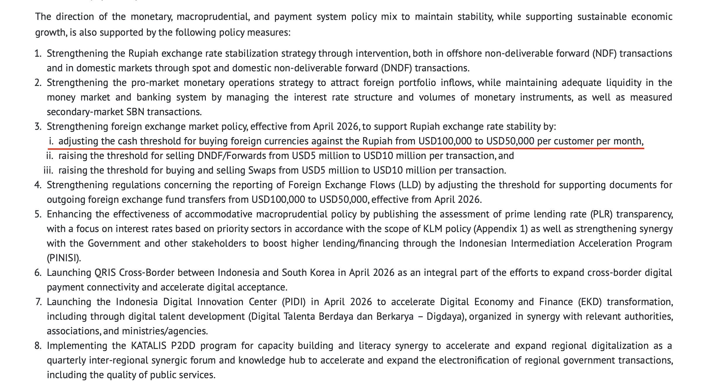 2026年4月1日,印度尼西亚央行(Bank Indonesia,简称BI)正式实施经修订的外汇交易报告制度。根据印尼央行理事会议条例2026年第7号(PADG No.7/2026),个人及机构每月无需提交交易证明的购汇额度由原来的10万美元下调至5万美元。任何超过前述额度的购汇操作,均须提交合同、发票等真实贸易或投资凭证。
