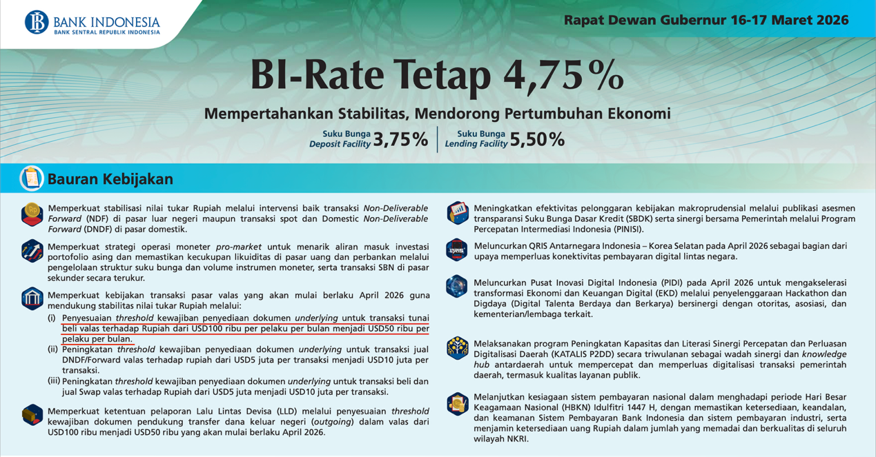 印尼央行理事会议条例2026年第7号(PADG No.7/2026)的实施,将外汇交易中强制提交基础交易文件(underlying documents)的监管触发阈值由10万美元下调至5万美元。在汇率波动背景下,该调整在既有外汇管理框架基础上,进一步提升了跨境资金流动监测与数据报送的要求,并强化了银行对交易真实性的审核责任。