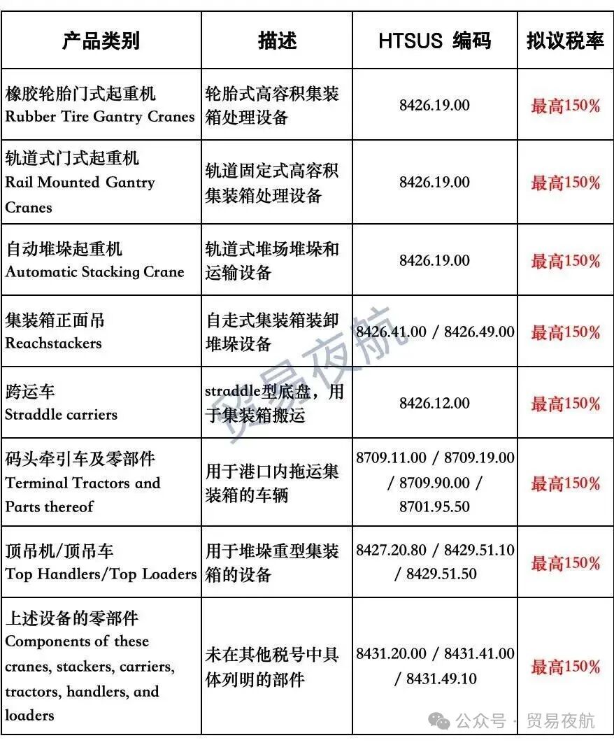 美国贸易代表办公室(USTR)宣布对特定中国制造的港口设备征收高额关税,作为Section 301行动的一部分,具体如下: