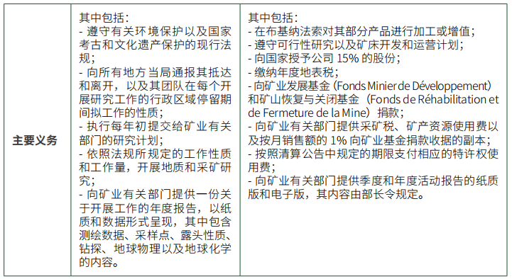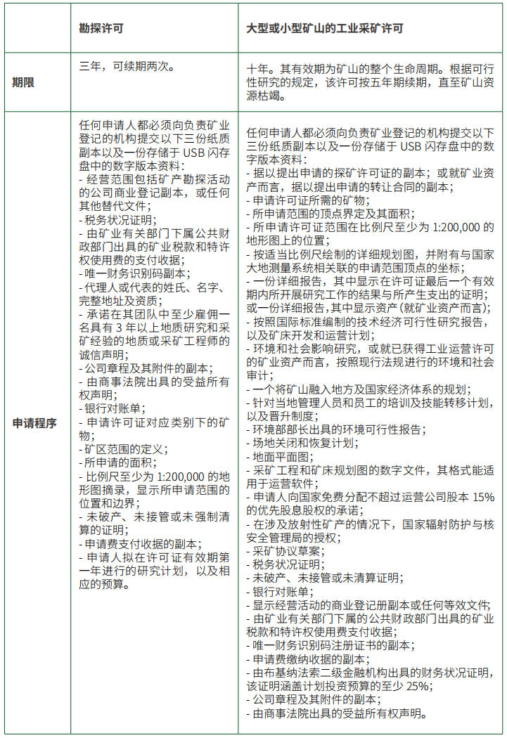 - 勘探许可:在先权利的前提下,依据矿业管理有关部门的部长令向任何提交符合现行法规申请的法人实体授予勘探许可。
