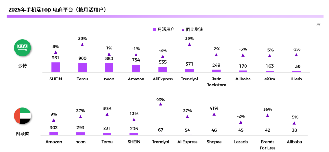 在沙特和阿联酋的电商市场中,以 SHEIN、TEMU、Noon 和 Amazon为代表的平台构成了当前的主流格局。值得注意的是,TEMU尽管于2023年才正式进入中东市场,但凭借其独特的商业模式和强劲的市场攻势,已迅速崛起并成为两国消费者广受欢迎的电商平台之一。