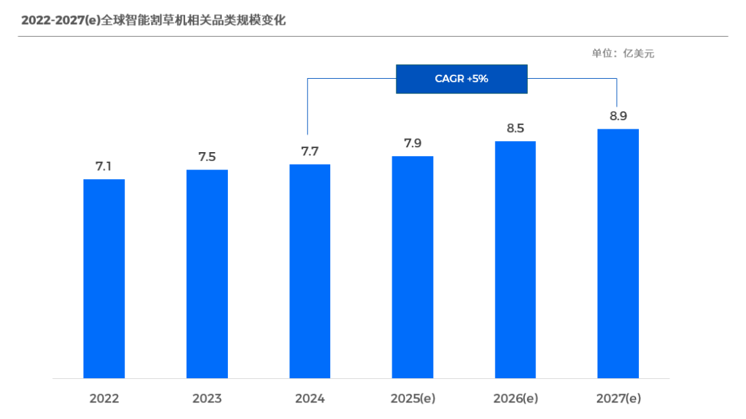数据显示,全球智能割草机市场在2024年已达到7.7亿美元的规模。预计从2024年至2027年,该市场将以5%的年复合增长率稳健增长,展现出强劲的发展势头。