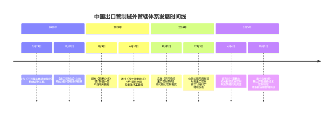 中国出口管制法的域外管辖体系秉持与美国不同的理念与逻辑,下面的时间线展示了中国出口管制域外管辖的关键发展节点: