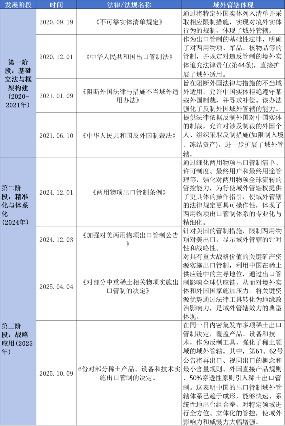 中国出口管制域外管辖体系的发展脉络可以概括为三个阶段: