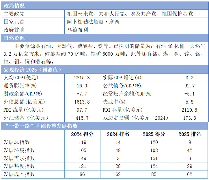 - 根据“一带一路”共建国家基础设施发展指数,2025年埃及基础设施发展指数得分为120,排名第9位。