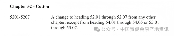 对于食品、纺织纱线、成衣、家具等(如第17、18、20、21章,42章,50-60章等)产品而言,非原产原材料需要发生HS编码特定数级的税则归类改变。以第52章棉织品为例,对于5201-5207的产品而言,适用于章改变标准,即两位数级的税则归类改变,但5401-5405及5501-5507的非原产原材料除外。