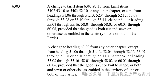 对于税目6303项下商品,美国《协调关税表》通用注释30第(h)项6规定,非原产原材料需从任何其他章变更至税目6303,但不包括从第51章的5106至5113子目、第52章的5204至5212子目、第53章的5307至5308子目或5310至5311子目、第54章,或第55章的5508至5516子目、第58章的5801至5802子目、第60章的6001至6006子目变更而来,且该商品需在巴林、美国或两国境内经过裁剪或编织成型(或两者兼具),并通过缝制或其他方式组装制成。”